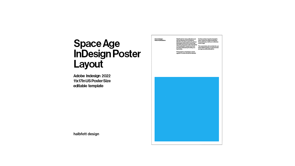 This Space Age InDesign grid is a fusion of the posters and stationary created by Massimo Vignelli for Nasa in the 1970s. Many of his designs and grids were used as inspiration for this clean and simple layout.